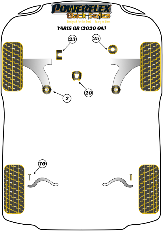 PFF76-920 Torque Mount Bush Insert is an affordable and easy-to-fit bush insert made from our Yellow 70A Durometer vibration-absorbing material, which works to stiffen the OEM torque mounting. This reduces twist of the engine under acceleration and during gear changes, giving the pedals a more direct feel, as well as reducing wheel-hop and letting you get the power down that little bit quicker. For milder applicationsPFF76-920can be fitted on it’s own, but will perform most effectively when fitted with our other Yaris GR powertrain inserts (PFF76-923 & PFF76-925) as a full set. There will be a minor increase in NVH when stiffening the powertrain mountings. Our POWERFLEX PFF76-920 Lower Torque Mount increases the stiffness of the OEM powertrain mounts using our yellow 70A material.